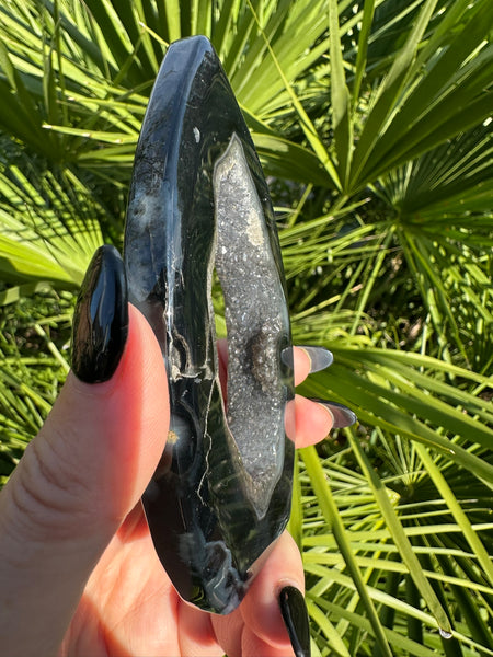 Bring a touch of natural magic into your space with this stunning black agate druzy flame. Each piece is open with a sparkling druzy center that catches the light beautifully — some feature hints of blue alongside the black for extra depth and character.